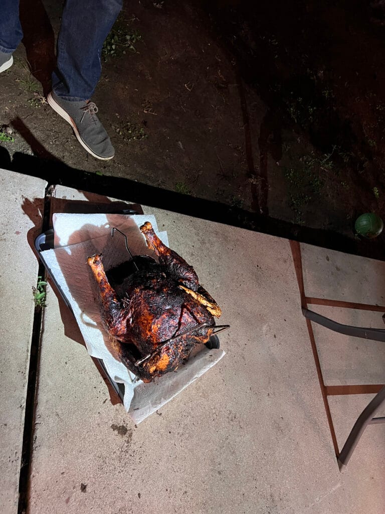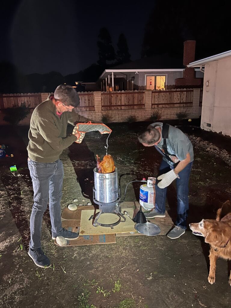 She’s cooked! Rory and Frank removing the turkey from the hot bath.