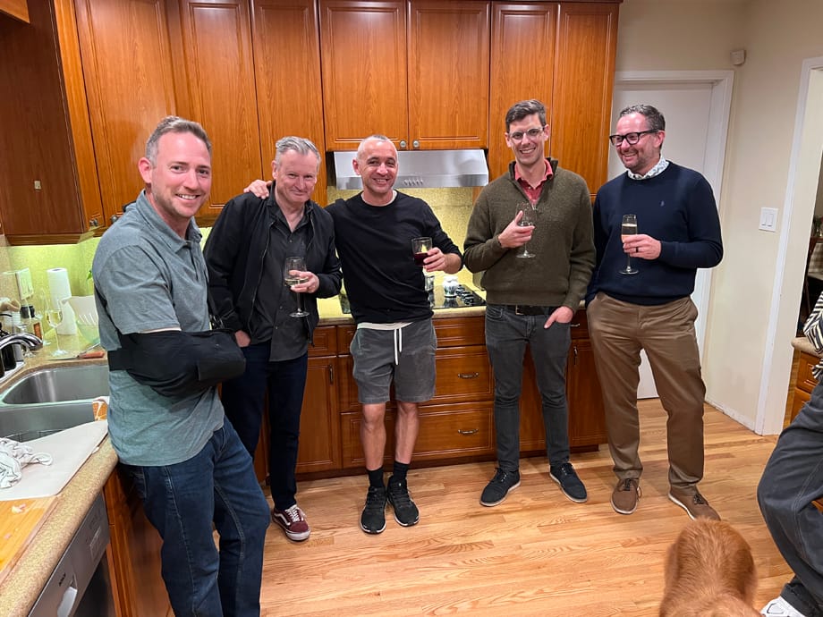 Frank, Neil, Mark, Rory, and Kevin hanging out in the kitchen.